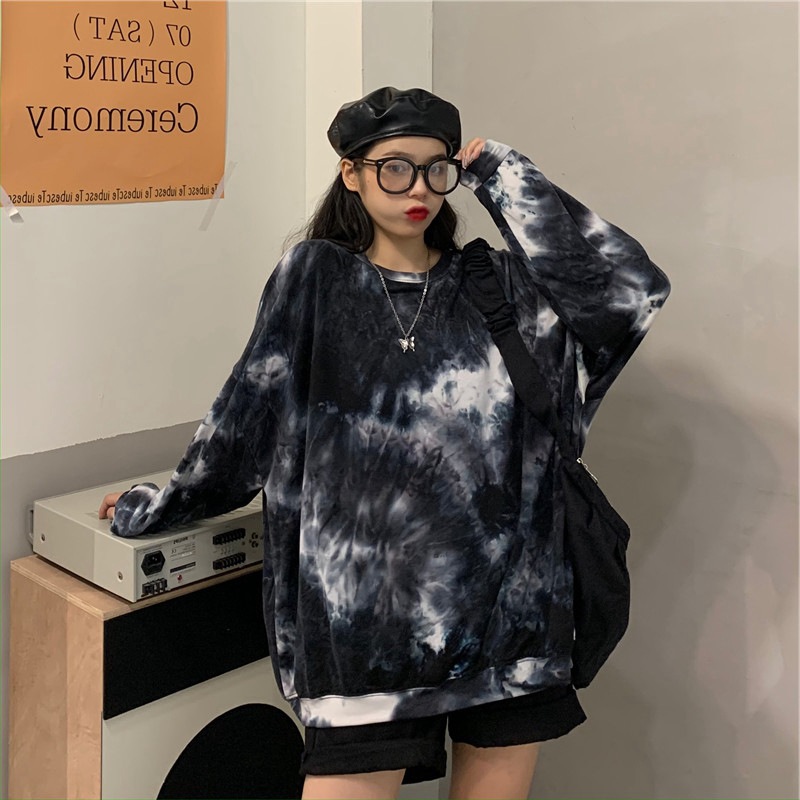 Kaus lengan panjang untuk wanita, T-shirt longgar ukuran besar bergaya Korea lazy gaya bf atasan celup kerah bulat panjang setengah untuk wanita 200kg