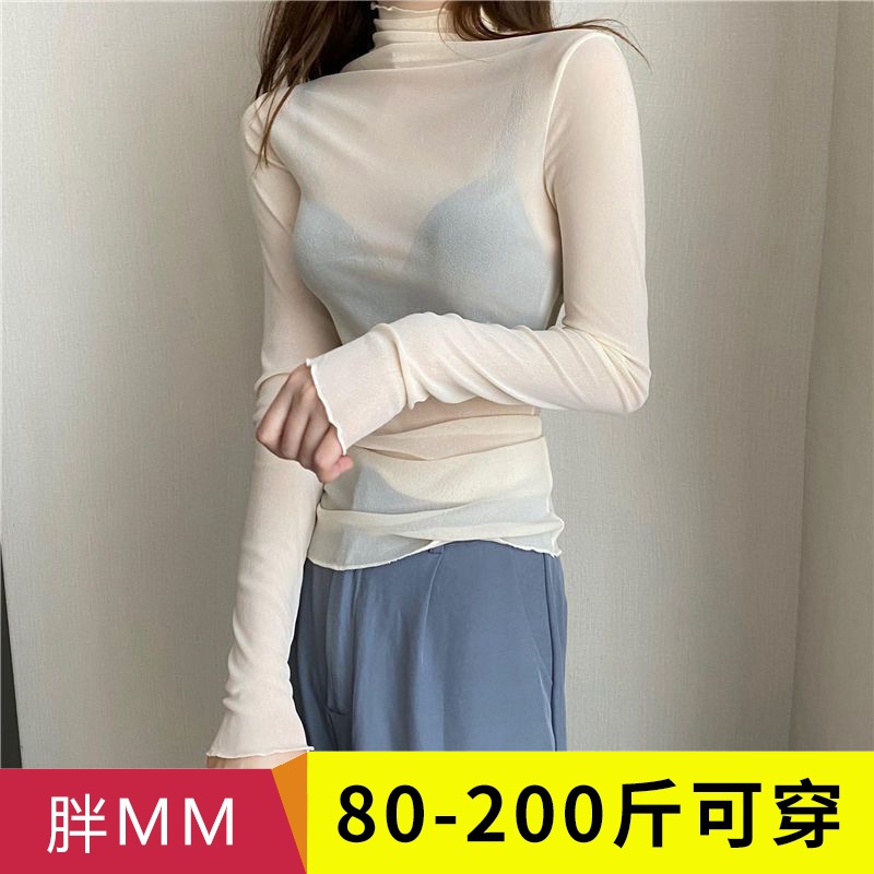 Pakaian Wanita Ukuran Besar Kemeja Bottoming Kerah Tinggi Anti Matahari Kaus Lengan Panjang Perspektif Seksi Musim Semi Musim Gugur MMM2025