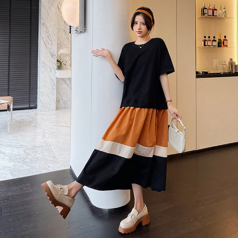 Real shot 2023 musim panas baru/longgar ukuran besar warna yang cocok rok jahitan palsu dua potong lengan pendek gaun pelangsing wanita