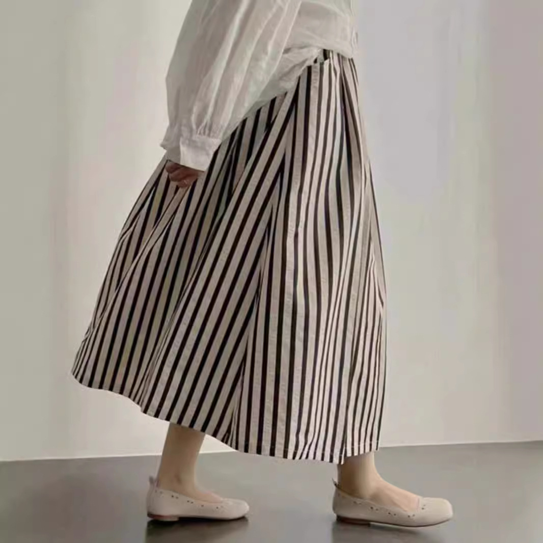 Rok Setengah Badan Elit Model Panjang Sedang Rok Ayunan Besar A-Line Rok Payung Pakaian Wanita Musim Panas Model Baru Motif Garis Warna Pinggang Tinggi Mudah Dipadu Padan