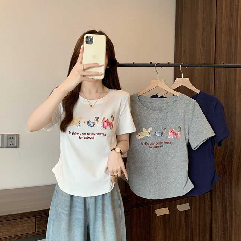 T-Shirt Lengan Pendek Bordir Huruf Huruf Kain Stiker Kartun Gaya Desain Mengurangi Usia Pakaian Wanita Ukuran Besar Wanita Gemuk Model Baru Musim Panas 2025