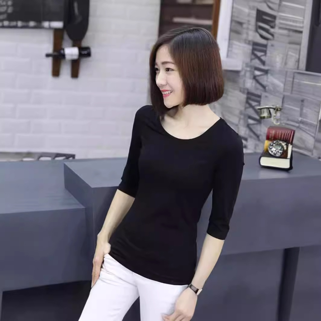 Kaus Ukuran Besar Lengan 3/4 Katun Murni Musim Panas 2025 Kaus Dalaman Longgar Lengan Pendek Wanita Atasan Terlihat Kurus Warna Polos Dalaman