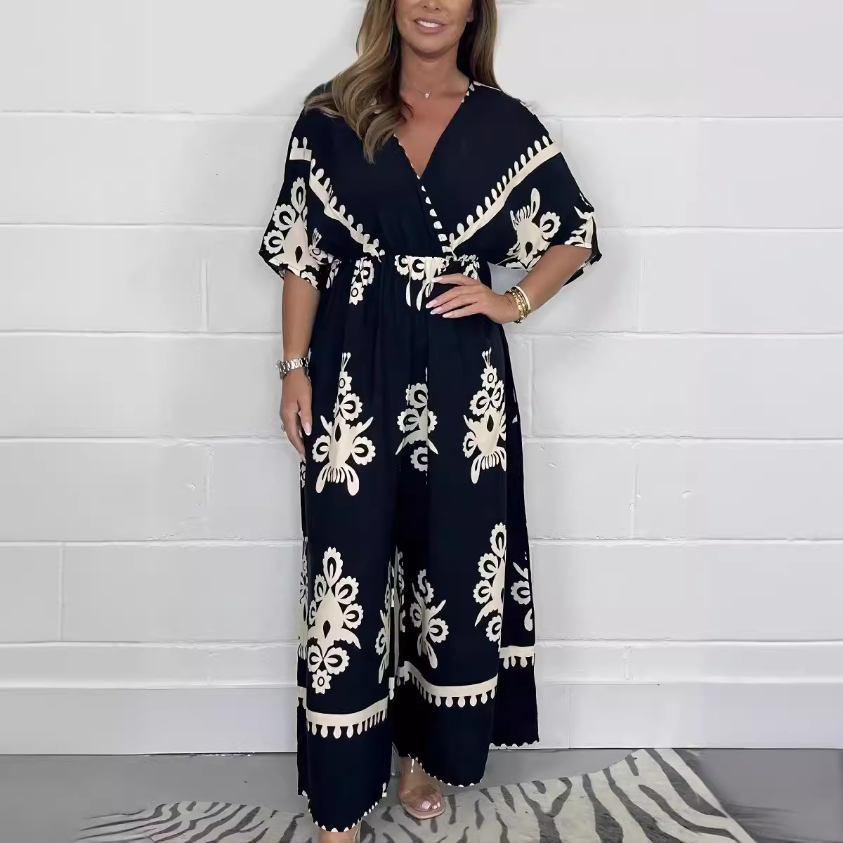 Setelan celana terusan longgar wanita, baju terusan longgar lengan pendek leher-v bermotif kasual Mode lintas batas Eropa dan Amerika ukuran plus untuk wanita