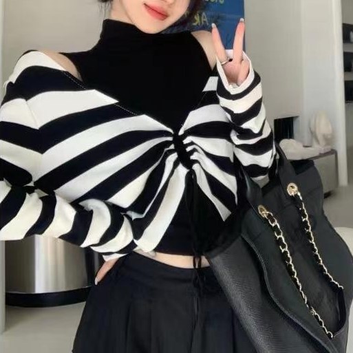 Baju rajut anak perempuan, Chubby Girl musim gugur dan musim dingin ukuran plus rajutan bergaris desain pelangsing blus tali serut + setengah turtleneck rompi dua potong mode