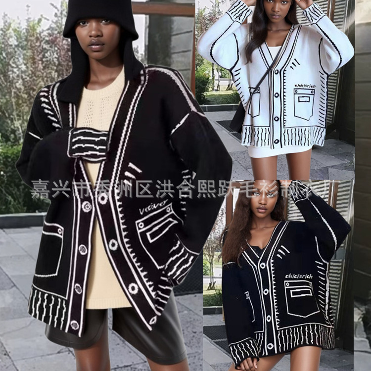 Amazon cross-border mantel Eropa dan Amerika baru warna longgar cocok kardigan kancing rajut perdagangan luar negeri sweater saku dekoratif untuk wanita