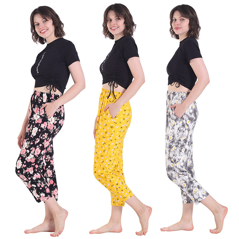 Grosir wanita musim semi dan musim panas baru tipis ukuran besar elastis tinggi kasual bottoming rumah longgar pelangsing bunga celana crop