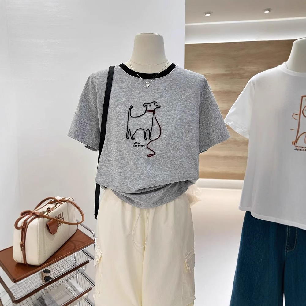 Kaus Dalaman Lengan Pendek Mengurangi Usia Longgar Anak Anjing Bordir Garis Kartun Musim Panas Ukuran Super Besar 240Kg Atasan Wanita Dalaman