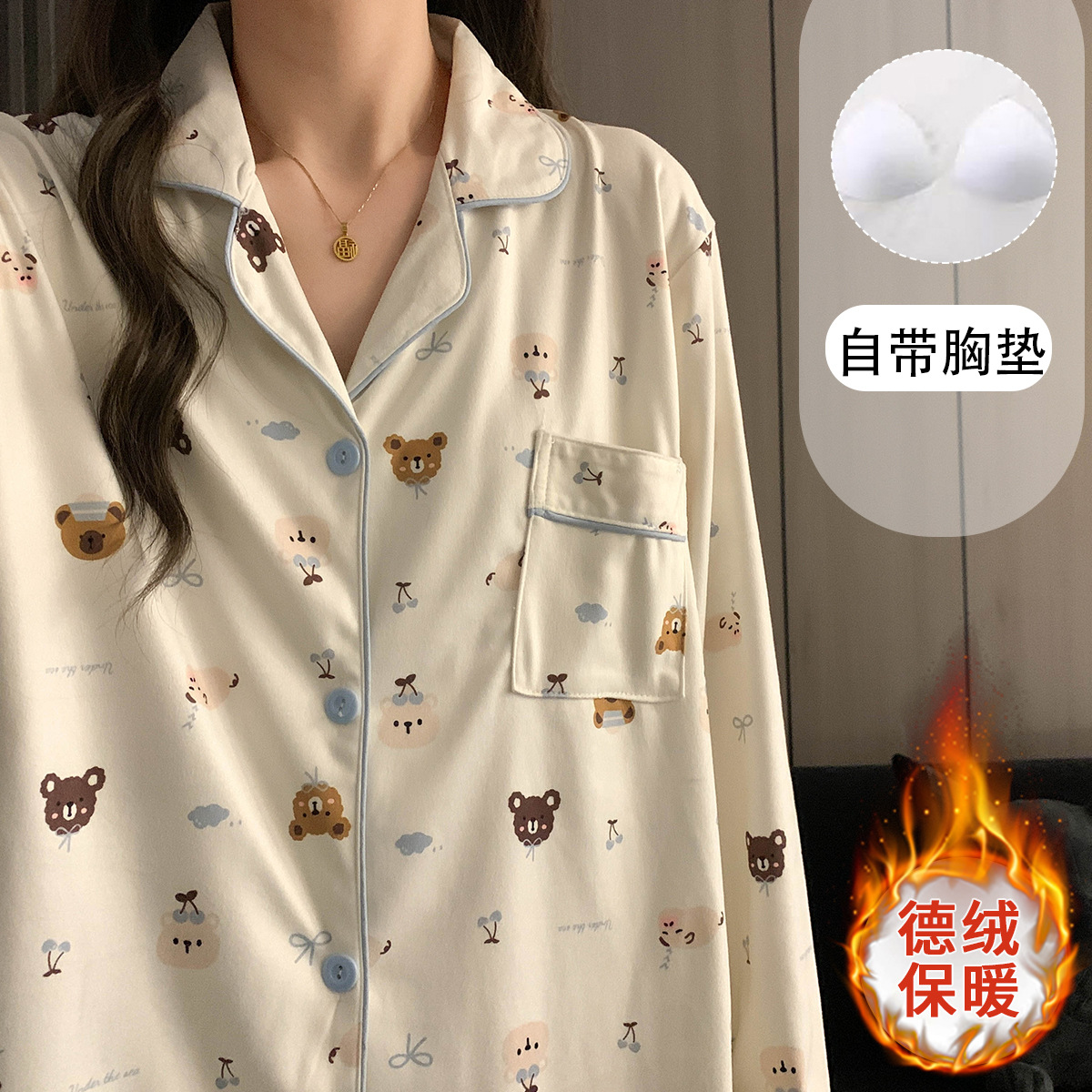 现货批发卡通奶呼呼小熊带胸垫一体大码睡衣女冬季双面磨毛家居服