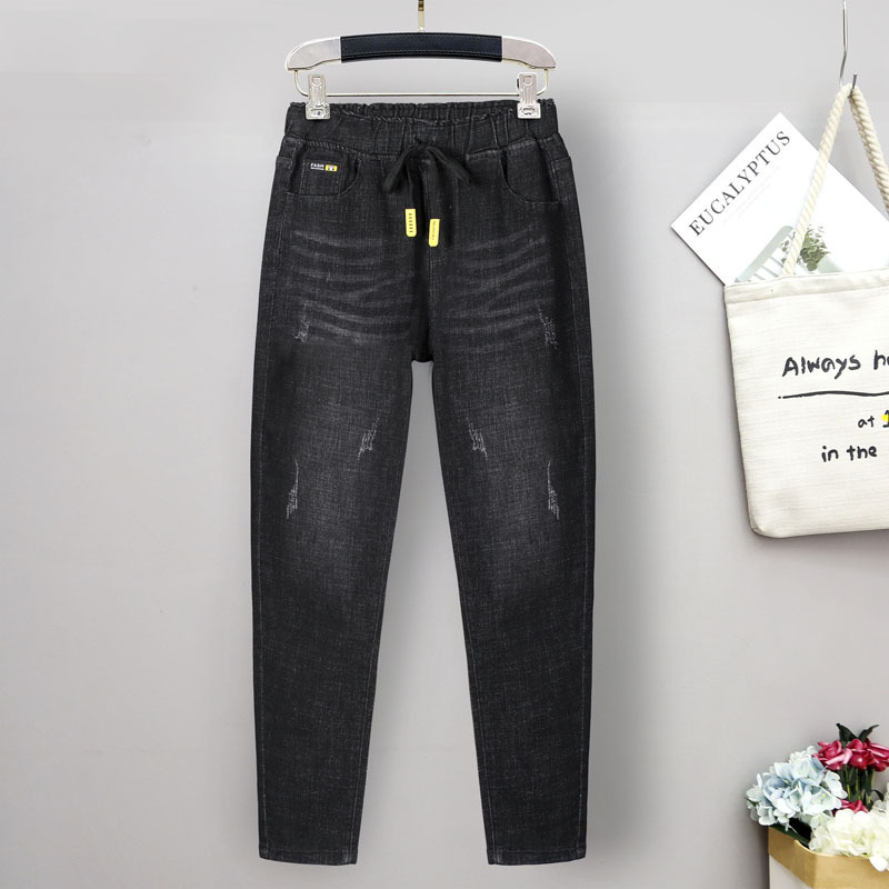 Jin celana jins elastis 230 celana harem wanita ekstra gemuk plus celana panjang kaki lebar ibu pelangsing lemak gaya Barat