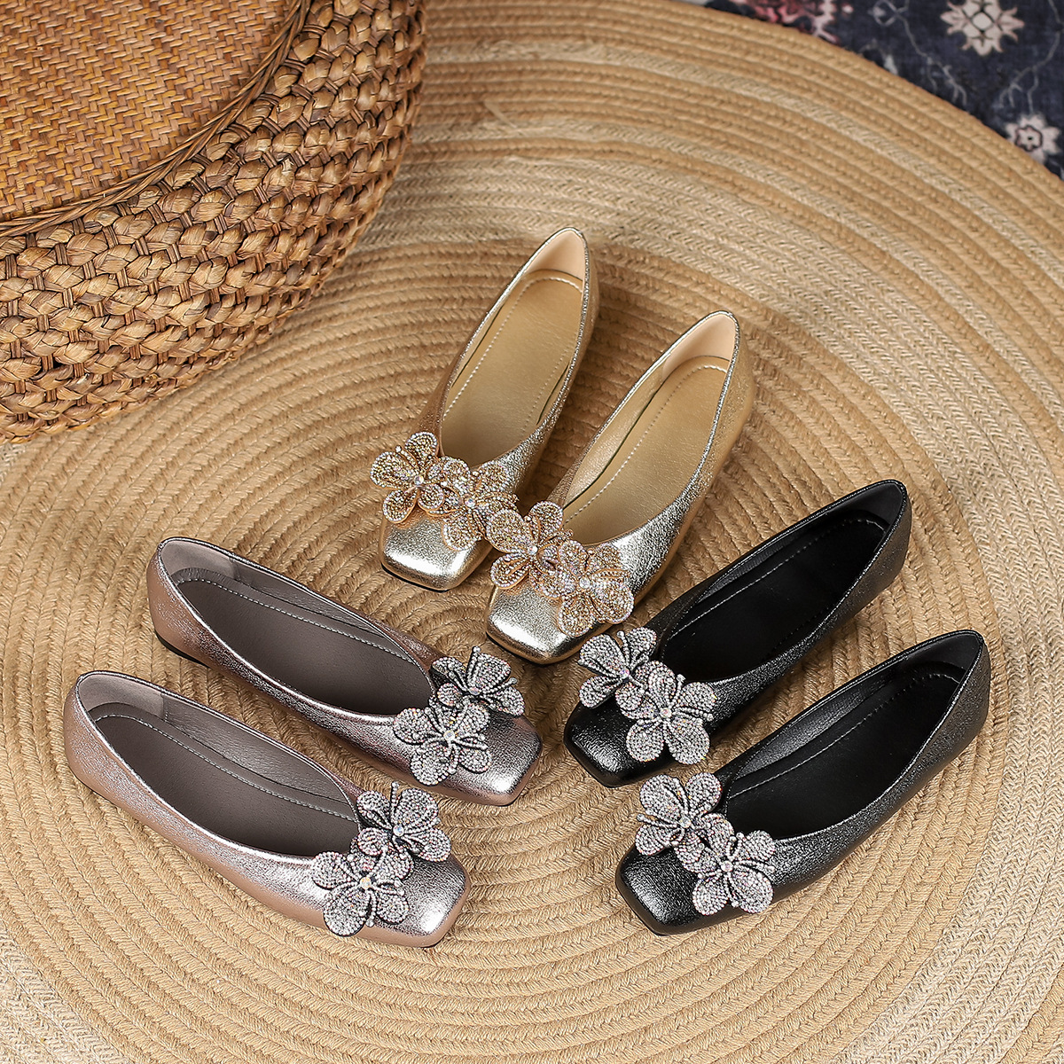 Sepatu Egg Roll 2024 Musim Panas Baru Ukuran Besar Sepatu Sendok Flat Sepatu Hak Tinggi Wanita Slip-On Elegan Mulut Dangkal Sepatu Wanita
