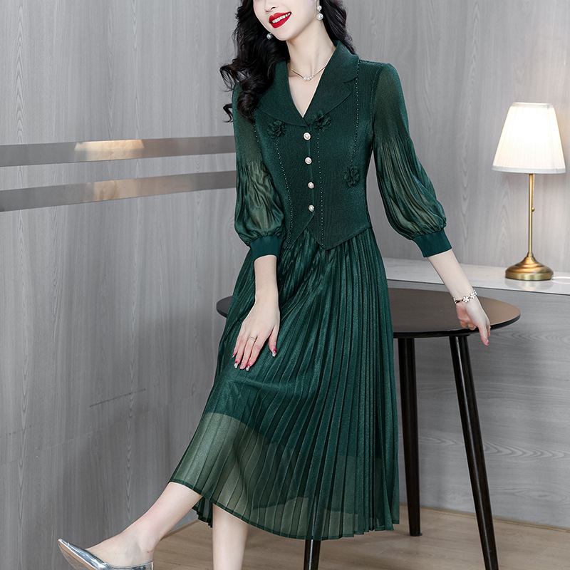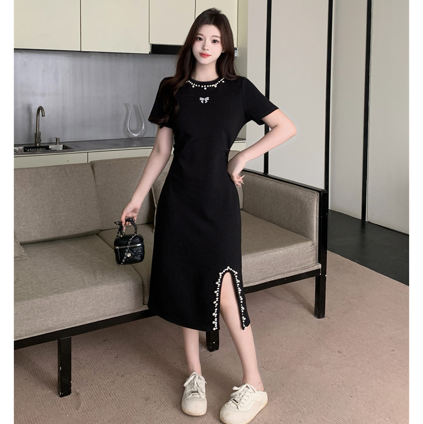 Gaun Panjang Sedang Elegan Mudah Dipadu Padan Terlihat Langsing Niche Desain Manik-Manik Modis Model Musim Panas Wanita Gemuk Model Baru 2025