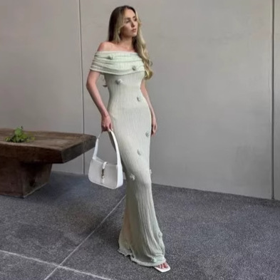 2025 Pakaian Wanita Eropa dan Amerika Cross-Border Gaun Bahu Bunga Tiga Dimensi Gaun Liburan Gaya Prancis Gaya Lembut