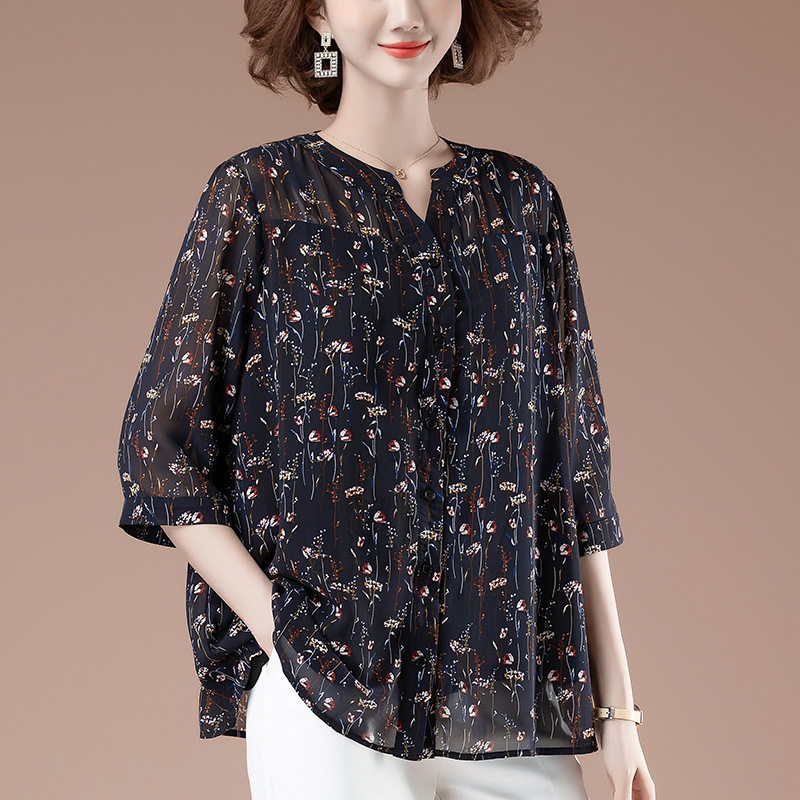 Kemeja sifon wanita ukuran besar, kaus bunga pelangsing pengurang usia sedang longgar lengan pendek musim panas 9563