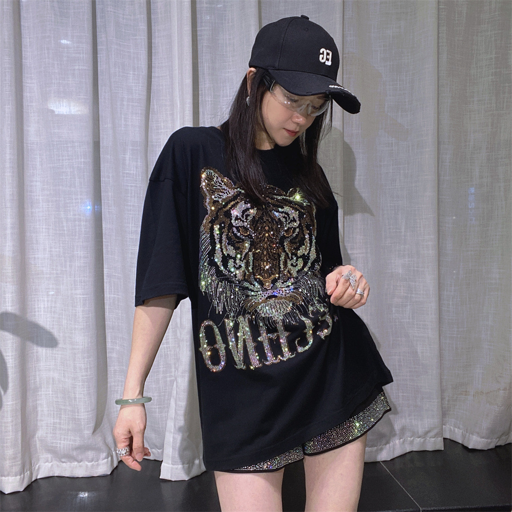 Kaus Lengan Pendek Pullover Kerah Bulat Katun Murni Wanita Gaya Amerika Atasan Pasangan Pria/Wanita Ukuran Besar Lengan Setengah Panjang Berlian Gemerlap Model Sama Pria dan Wanita Musim Panas