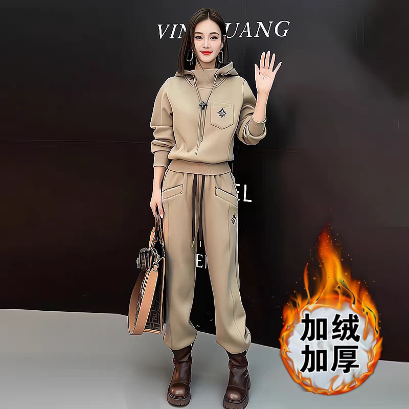 Setelan pakaian olahraga wanita, pakaian Eropa berlapis bulu tebal Musim Semi dan Musim Gugur 2024 gaya Barat baru mengurangi usia sweater hoodie set dua potong
