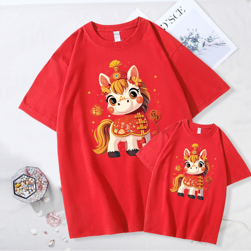 新年亲子装短袖红色本命年喜庆一家四口家庭装活动聚会母女装t恤