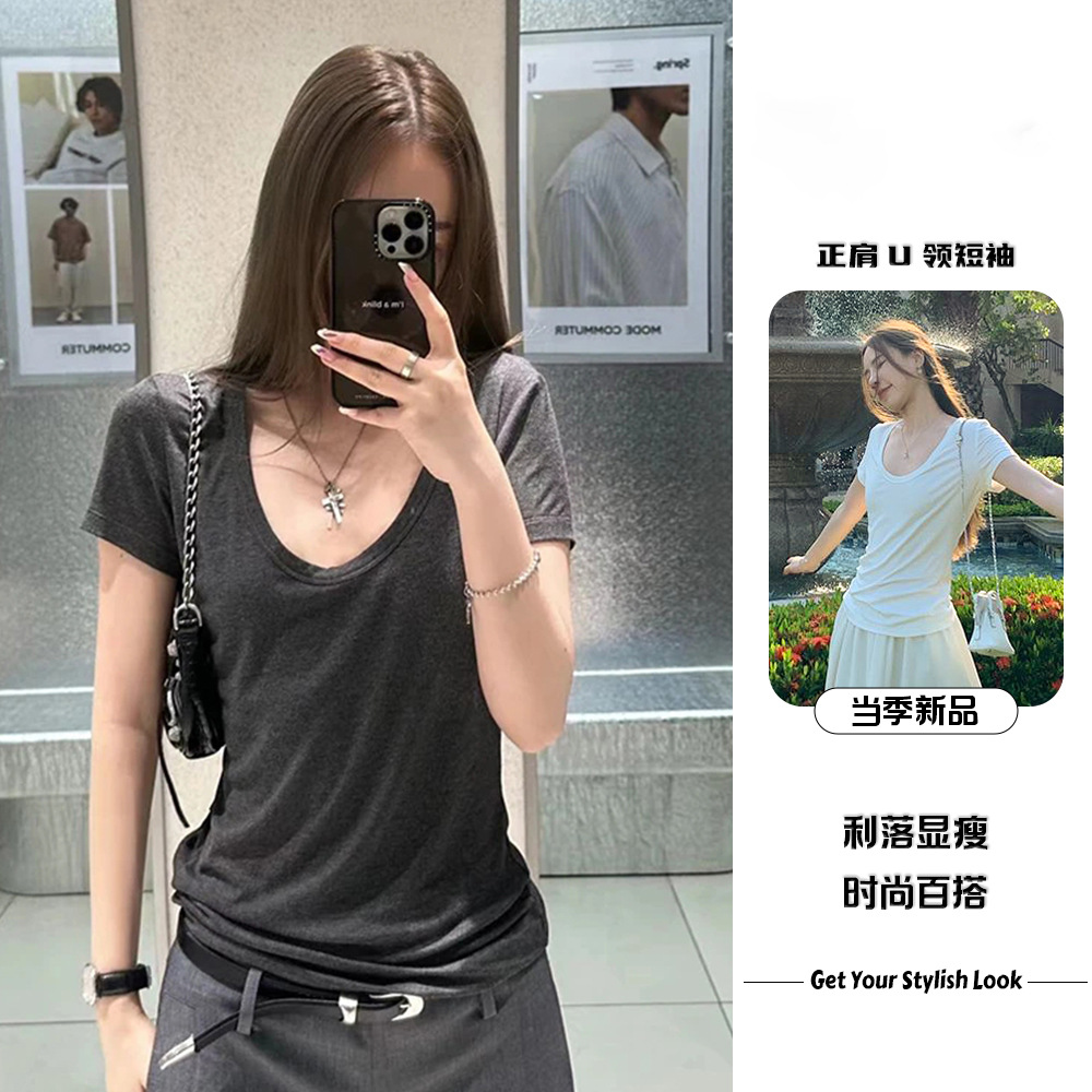 正肩收腰宽松U领显瘦百搭慵懒风2025夏季女纯色设计感垂感上衣潮