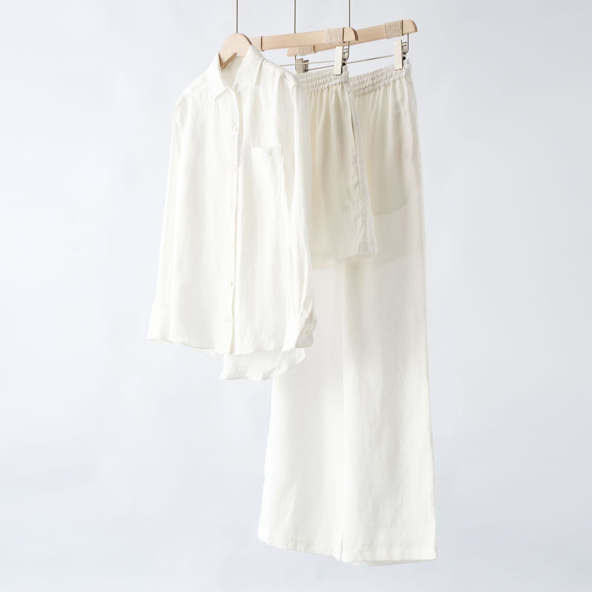 Orang-orang membual ~ Kemeja BF Longgar Warna Putih Linen Celana Pendek Pinggang Tinggi Celana Lurus Model Panjang Gaya Down Setelan Tiga Potong Wanita