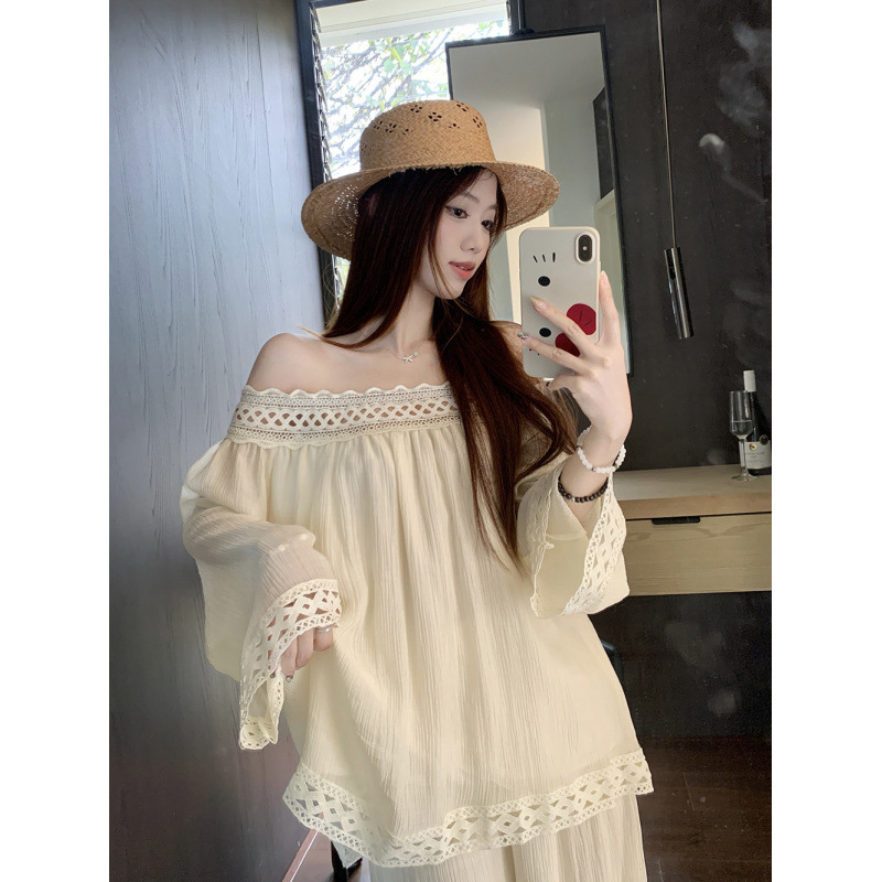 Kemeja Lengan Panjang Bahu Berongga Pinggiran Bunga Bordir Ukuran Besar 300Kg Wanita Gemuk Celana Kaki Lebar Pinggang Tinggi Dua Set 2 Wanita