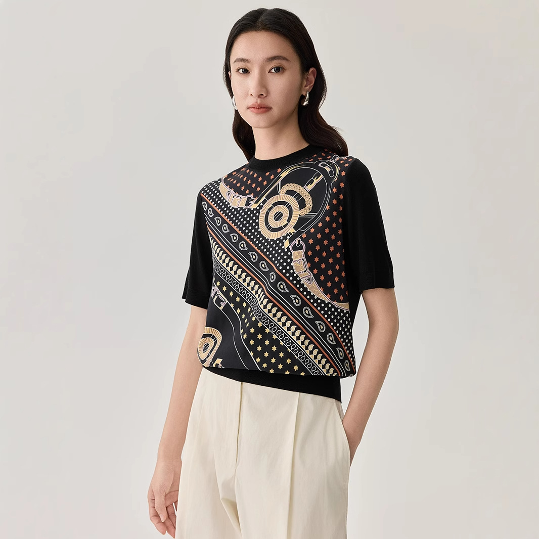 2025新品春季桑蚕丝拼接圆领短袖 重磅真丝斜纹绸洋气T恤女薄款