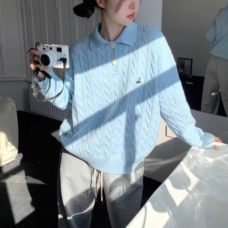 Sweater Pullover Kerah Polo Retro Gaya Amerika Berat Atasan Warna Biru Lembut Gaya Korea Model Baru Musim Gugur Musim Dingin Wanita Atasan Rajutan Bunga