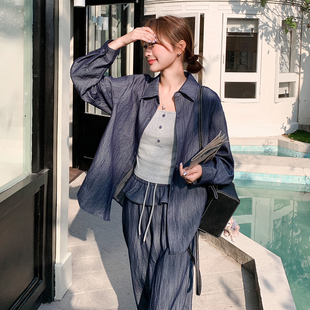 Setelan Modis Musim Semi dan Musim Gugur Kemeja Dua Potong Gaya Desain Longgar Gaya Korea Kemeja Jeans Kaki Lebar Pinggang Tinggi Setelan Dua Potong