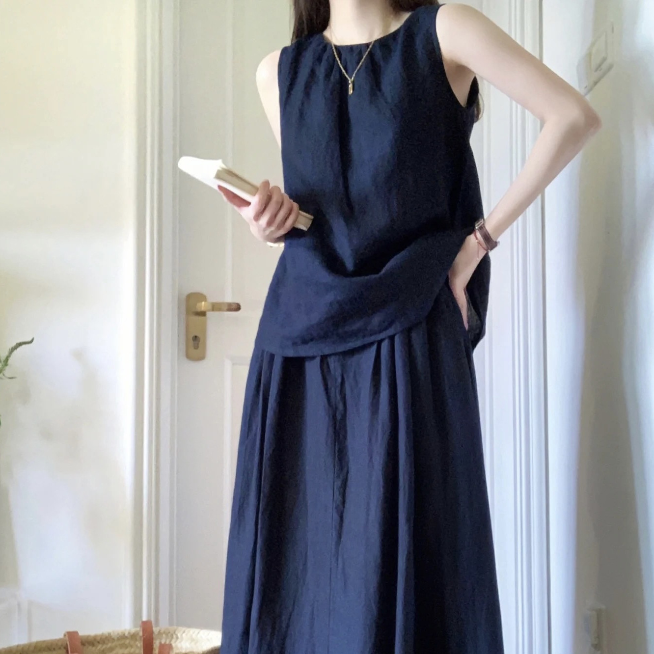 Set Kemeja Tanpa Lengan Linen Warna Campuran Mudah Dipadu Padan Terlihat Langsing Longgar Biru Langit Model Baru Musim Panas 2025