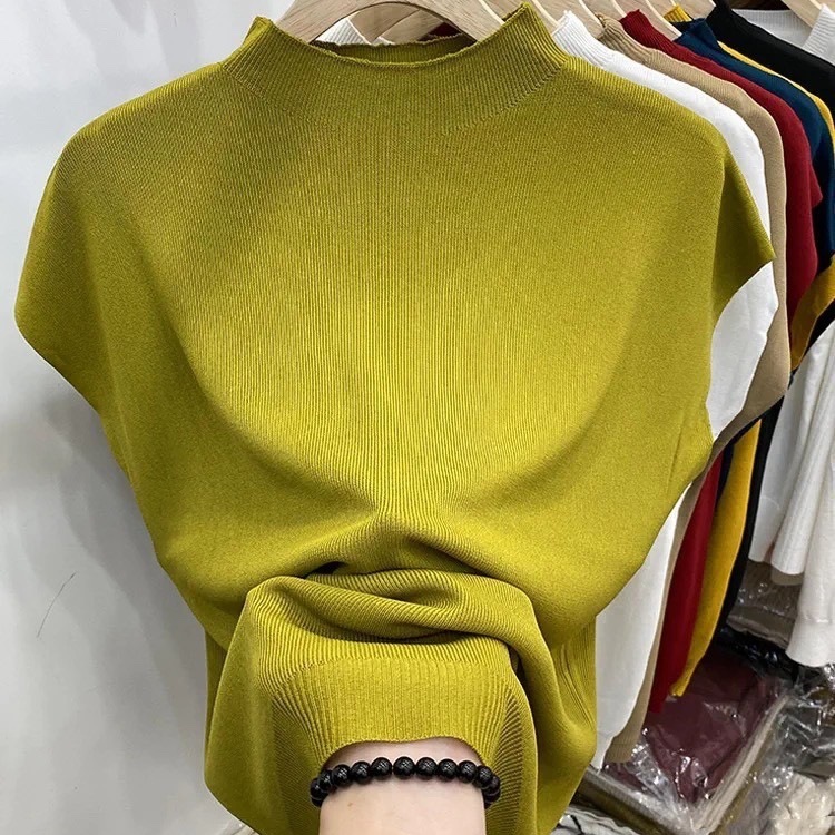 Kaos Lengan Pendek Rajutan Warna Solid Kerah Setengah Tinggi Musim Semi Musim Panas Atasan Lengan Gelembung Gaya Prancis Sweater Longgar untuk Dipakai Luar Wanita