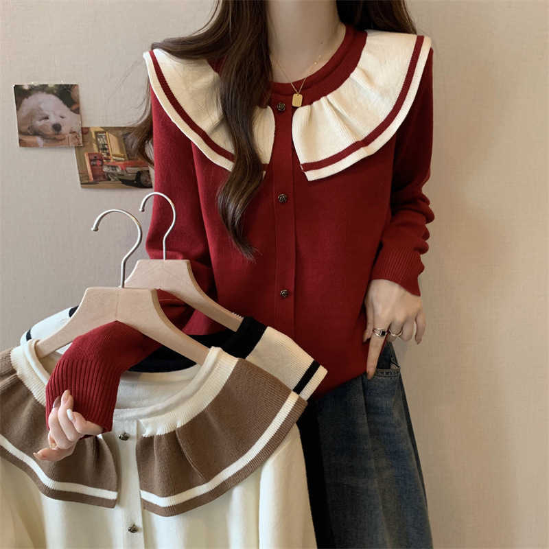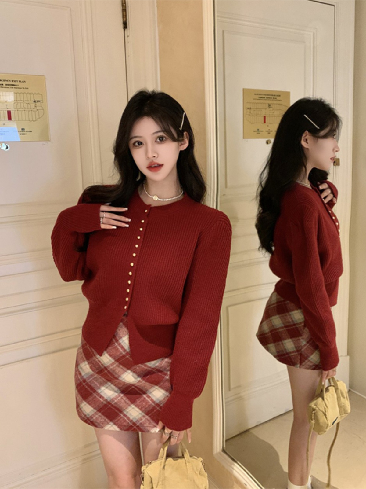 Sweter rajut lengan panjang retro Prancis wanita, kardigan pendek temperamen merah niche desain baru musim gugur 2023