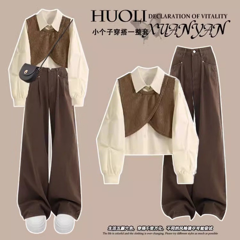Set Tiga Potong Rompi Kemeja Kasual Longgar Gaya Garam Set Celana Lebar Kaki Model Baru Musim Semi Musim Panas 2025 Wanita