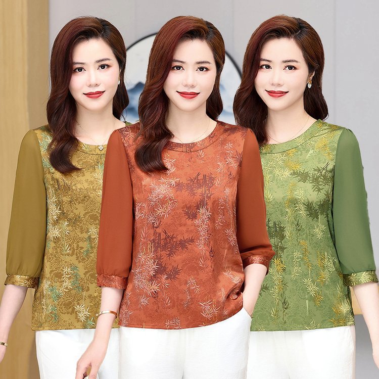 Kemeja Lengan 3/4 Motif Bunga Kerah Bulat Gaya Tiongkok Model Baru Musim Semi Musim Gugur 2024 Atasan Kaos Wanita Modis Baju Ibu