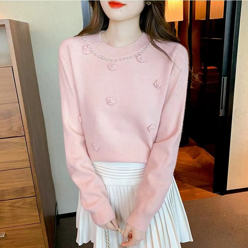 Sweter bottoming wanita dengan pelat manik-manik, kemeja dasar bunga musim gugur dan musim dingin gaya Korea warna permen pengurang usia gaya lembut manis lengan panjang