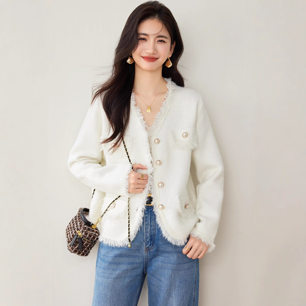 R5249 Jaket Rumbai Kerah V Gaya Chanel Model Baru Musim Gugur dan Musim Dingin Sweater Rajutan Wanita Kardigan Bulu Mink Imitasi Lembut