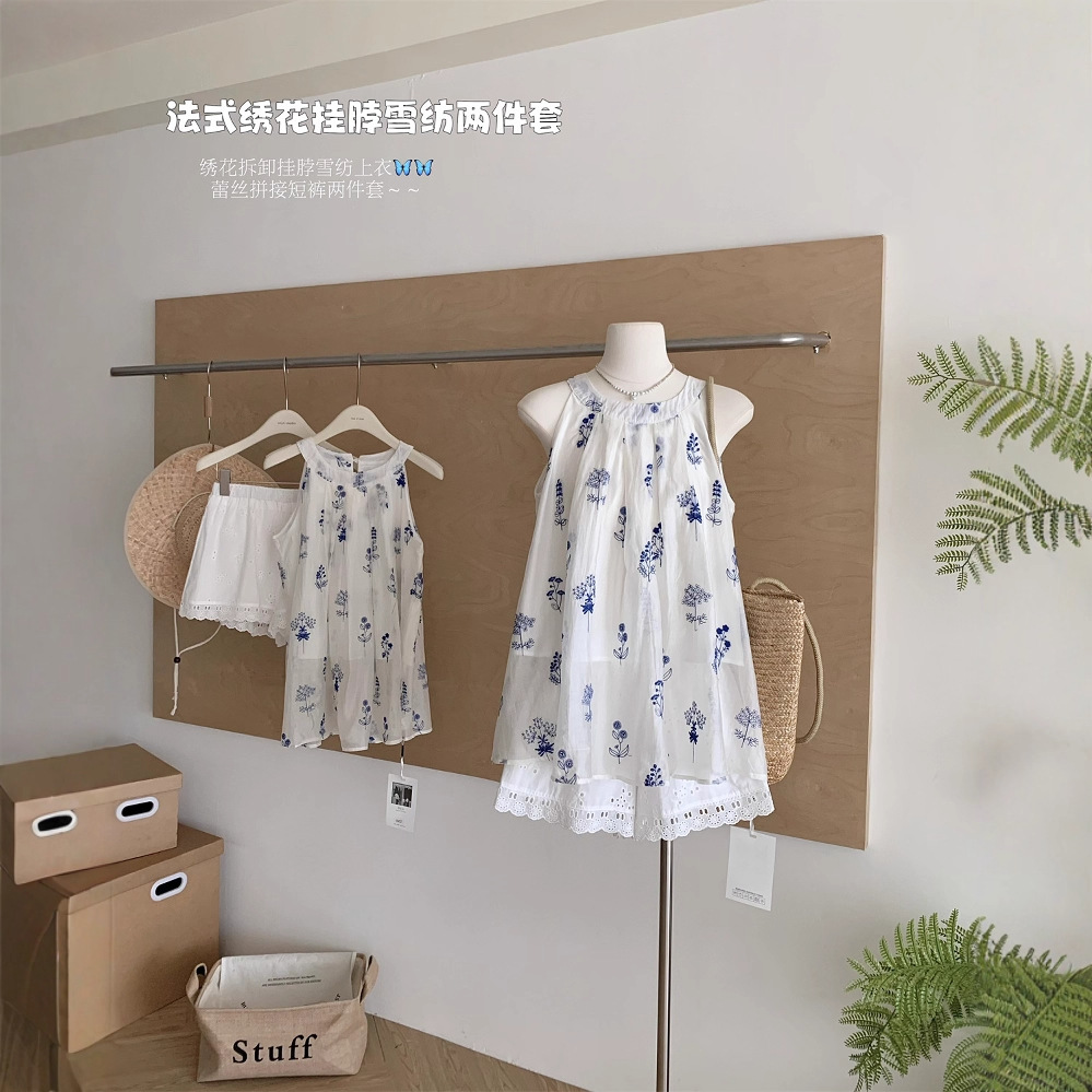 法式氛围感刺绣挂脖度假风短裙夏+花边慵懒风宽松短裤两件套女