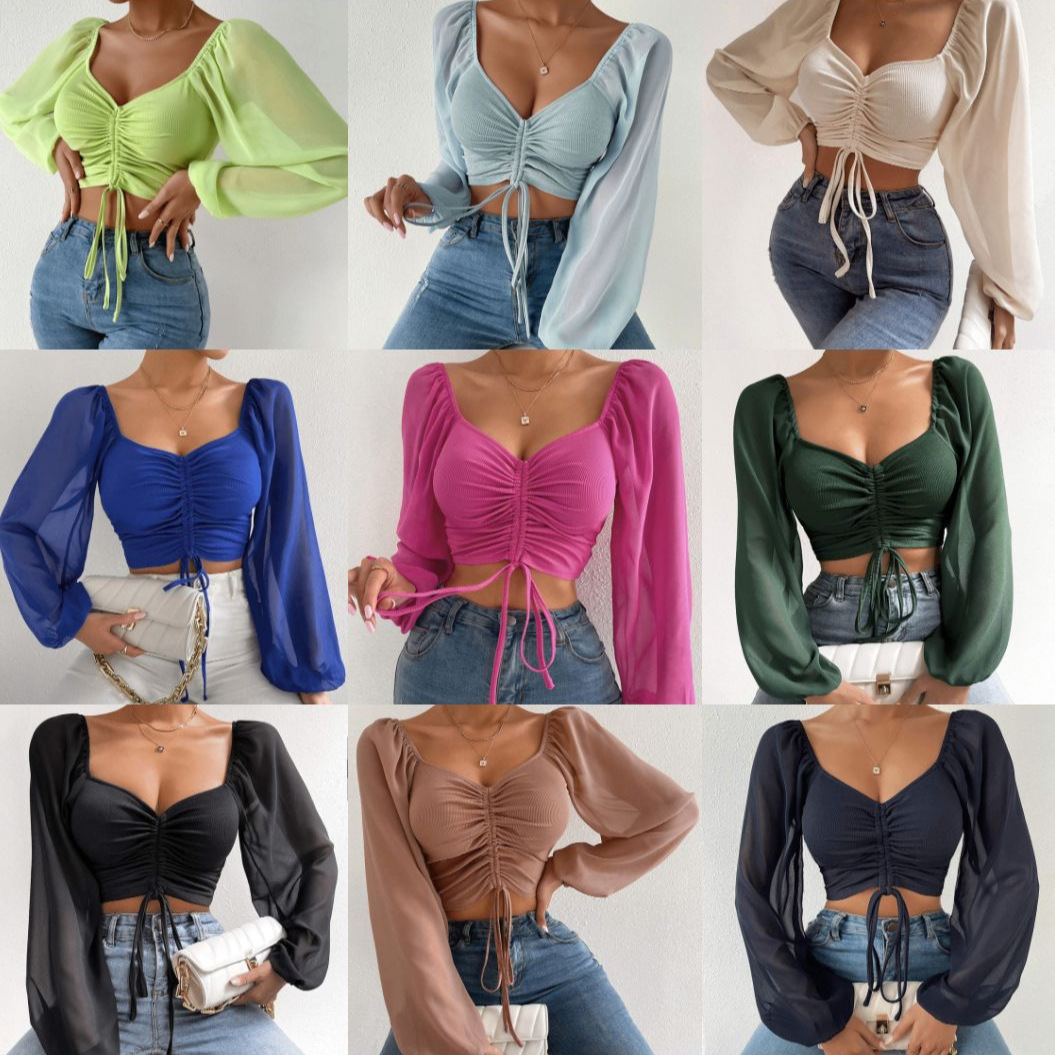 Amazon AliExpress Atasan wanita ketat tali serut lengan lentera kerah ayam pendek kasual wanita stok tersedia