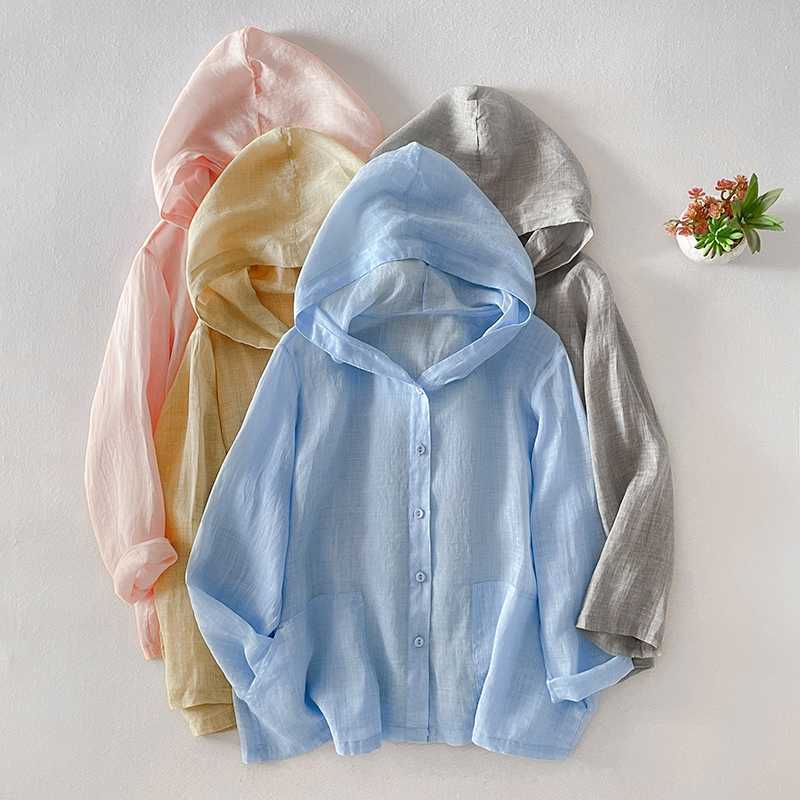 Jaket Berkerudung Ramie Tipis dan Ringan Kemeja Lengan Sembilan Persen Wanita Kardigan Kemeja Tabir Surya Musim Panas Seni Longgar Atasan Netral