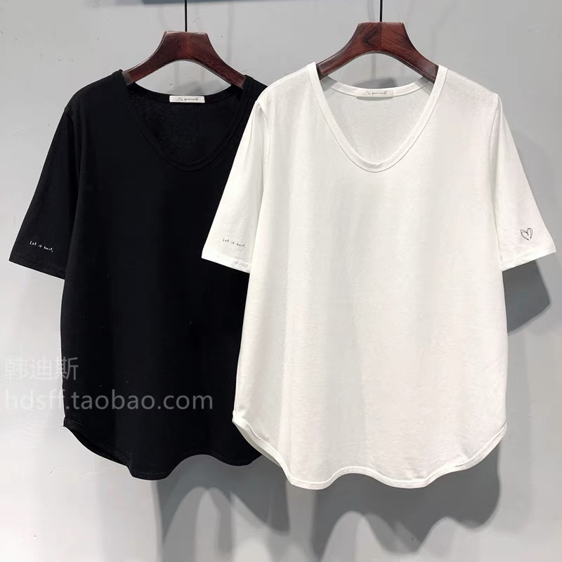 Kaus Lengan Pendek Warna Polos Kerah V di Bagian Bawah Tidak Beraturan Wanita Ukuran XL 240Kg Kaus Lengan Setengah Lengan Terlihat Langsing Longgar Musim Panas Wanita