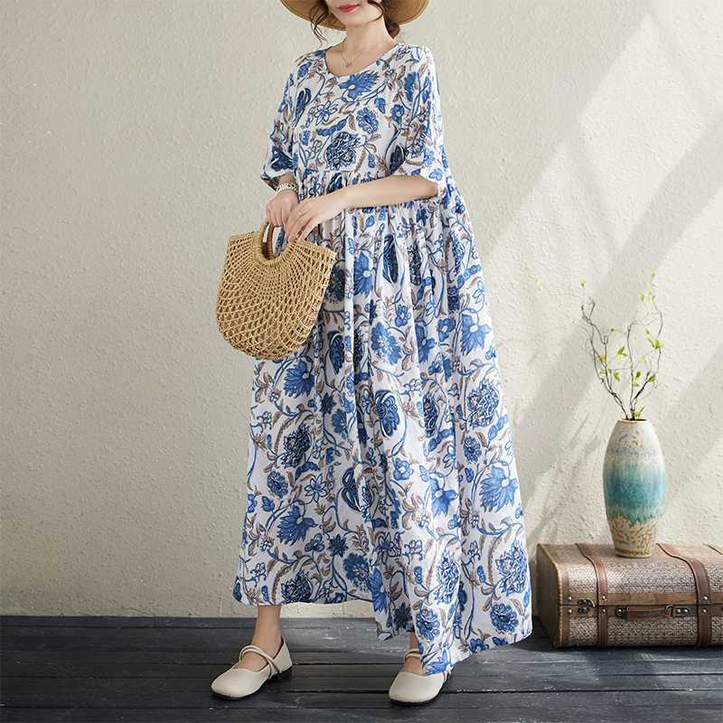 Gaun lengan pendek wanita, gemuk anak perempuan ukuran besar retro artistik Musim Panas 2024 gaya etnik leher bulat pullover gaun lengan pendek