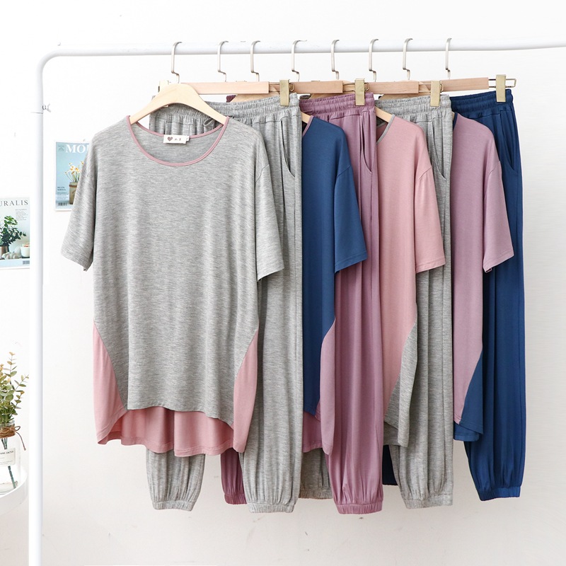 Setelan pakaian wanita lengan pendek, atasan kaus lengan pendek kasual ukuran besar longgar warna kontras model baru musim semi dan panas