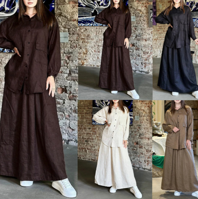 Rok Kemeja Lengan Panjang Kerah Terbalik Retro Ukuran Besar Wanita Model Baru Musim Gugur 2024 Lintas Batas Eropa Amerika Setelan Dua Potong Kasual
