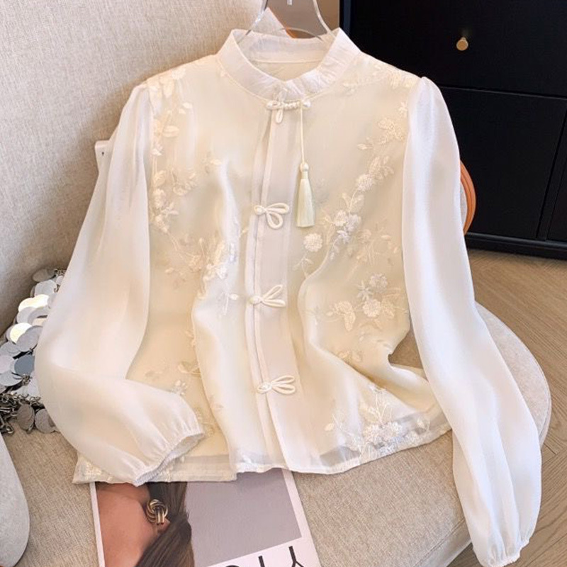 新中式国风刺绣盘扣长袖雪纺衬衫女2025新款宽松流苏立领复古上衣