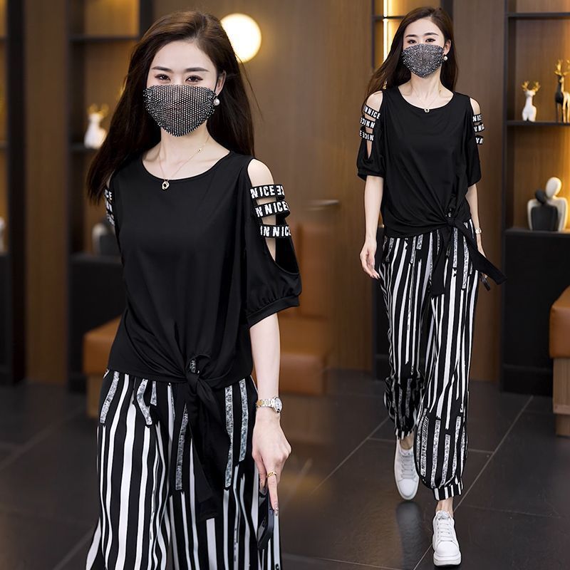 Setelan Olahraga Kasual Ukuran Besar Wanita Atasan Tidak Beraturan Bahu Terbuka Gaya Desain Modis Model Baru Musim Panas Celana Bergaris Dua Set