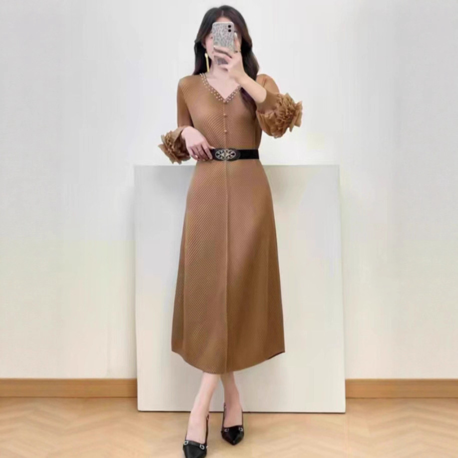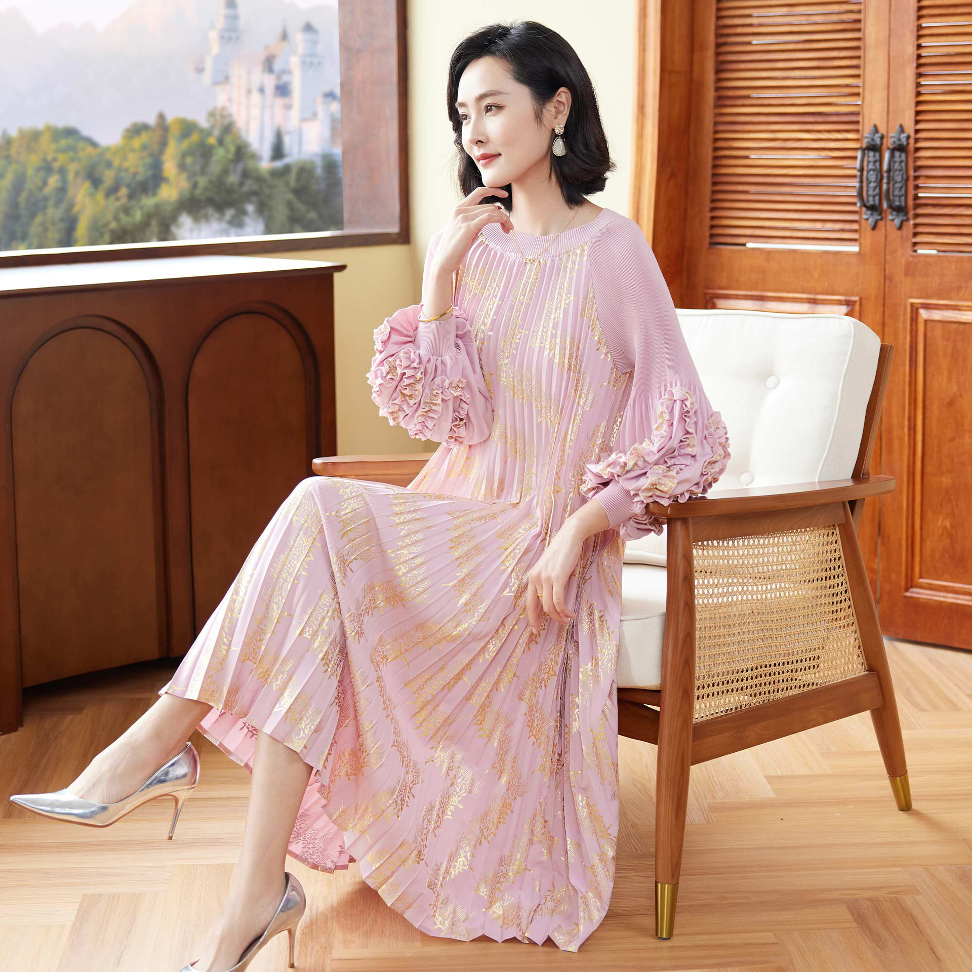 miyake褶皱欧美跨境新款大码连衣裙时尚钉珠气质宽松优雅女装长裙