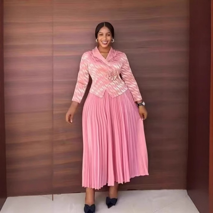 Miyake Cross Border Afrika Eropa dan Amerika Grosir Model Baru Hot Stamping Kerah Terbalik Bertali Modis Ukuran Besar Rok Wanita Terlihat Langsing