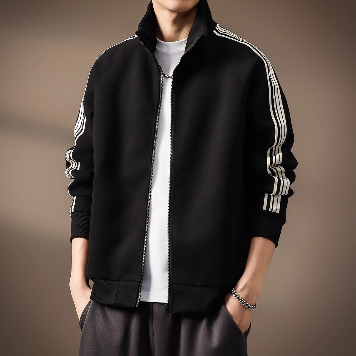 开衫卫衣男2025春秋季新款美式潮牌立领夹克条纹运动休闲外套跨境