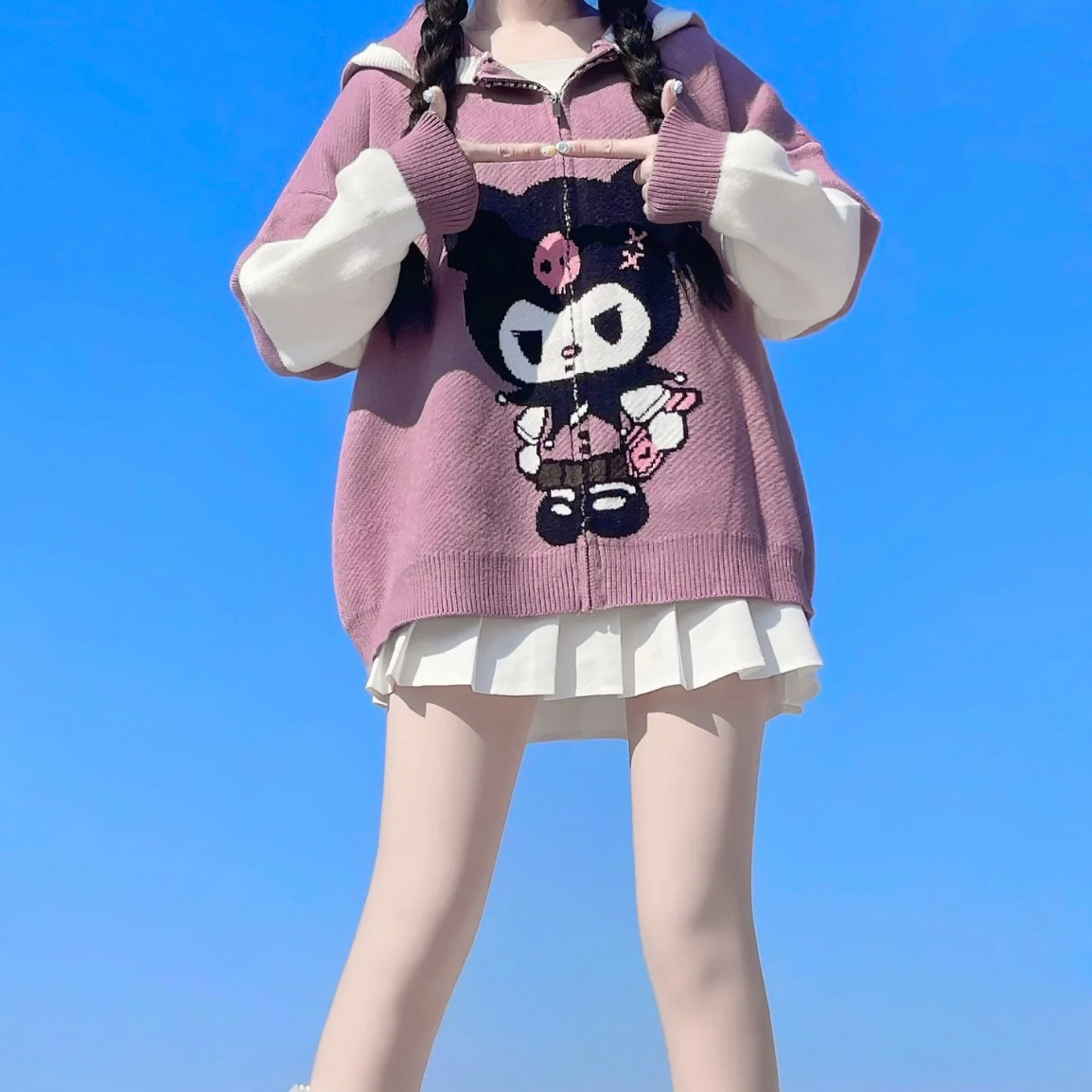 Kuromi Sweater Terlihat Langsing Longgar Elegan Gaya Kampus Model Baru Musim Semi Musim Gugur Wanita Kardigan Bertopi Rajutan Manis