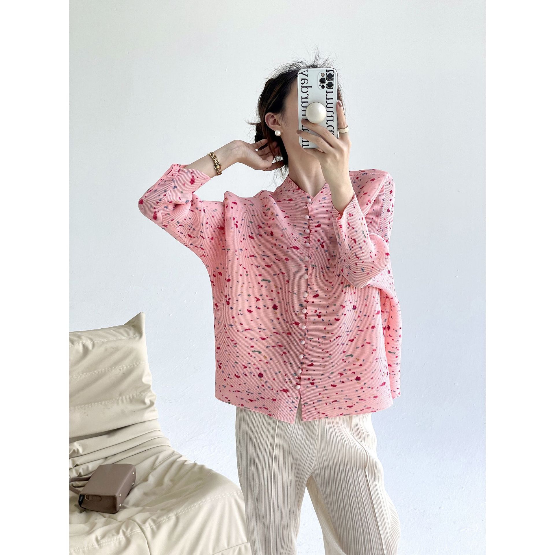 Miyake 2025 Musim Semi dan Musim Gugur Baru Kardigan Kerah Berdiri Cetak Mewah Atasan Berlipit Elegan Longgar Serbaguna Jaket.