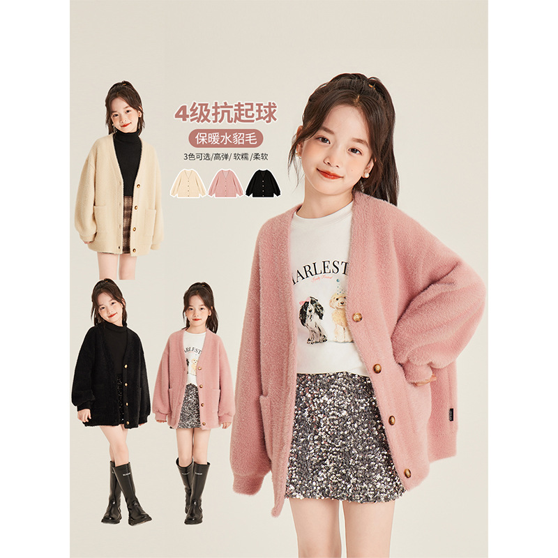 Amybaby女童上衣冬季2024新款纯色软糯慵懒风宽松针织开衫外套