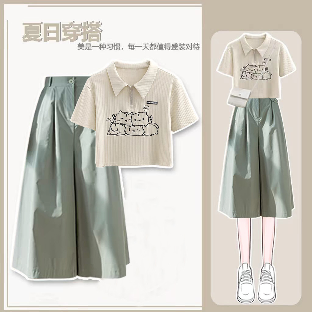 Setelan pakaian Musim Panas 2024 baru kaus pendek gaya Korea pelajar + celana kaki lebar potongan dua potong