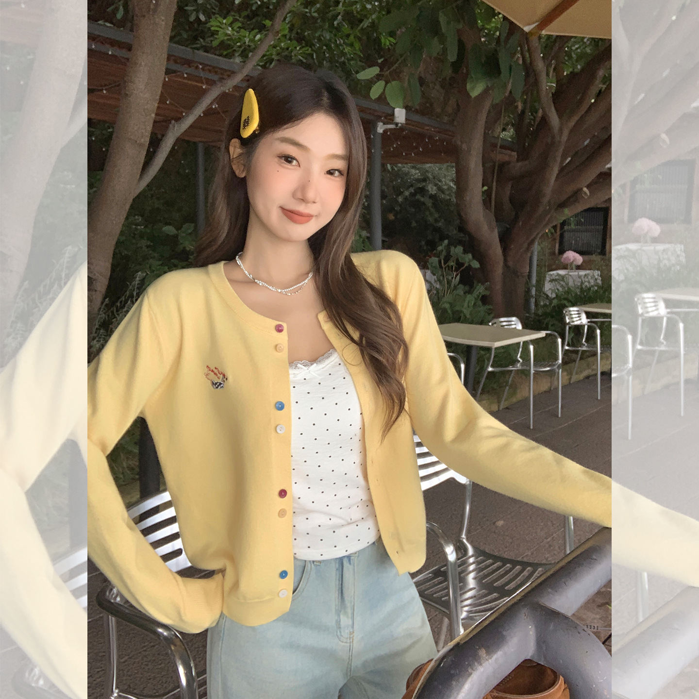 韩系黄色刺绣长袖圆领针织开衫女2025早秋穿搭外套慵懒风宽松上衣